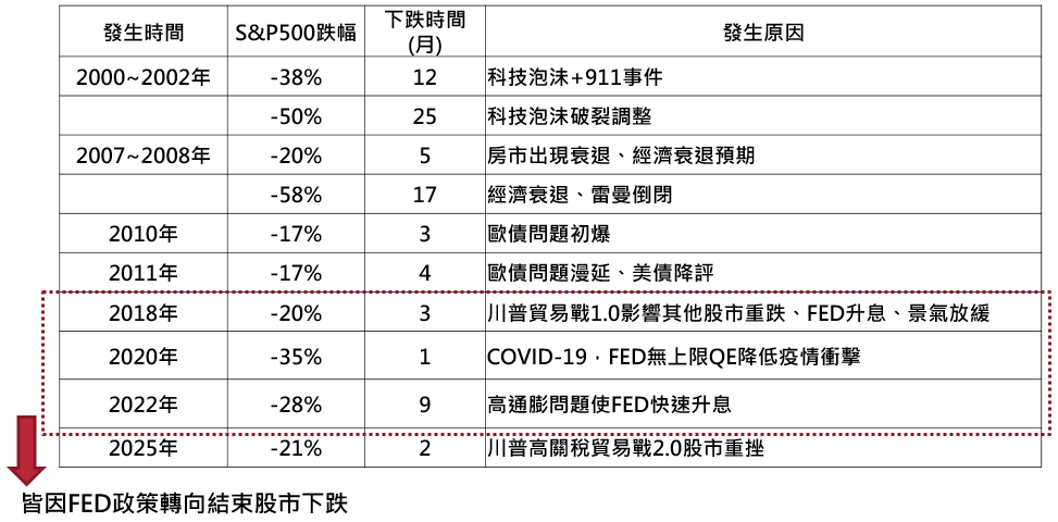 川普4/2宣布的高關稅政策後,造成股市大跌、極度恐慌、融資籌碼鬆動、台股融資餘額大減近四成,若計算至4/7~4/9股市反應川普關稅措施的本波股市下跌低點,美股(標普500指數)及台股從歷史高點分別下跌21%及29%,從歷次股市大跌的表現觀察,此已反應經濟未衰退的重大事件影響,或是已反應美國經濟溫和衰退的水準。(見下表)➋ 關稅措施緩和及Fed寬鬆政策再現,為股市能否轉折向上關鍵
