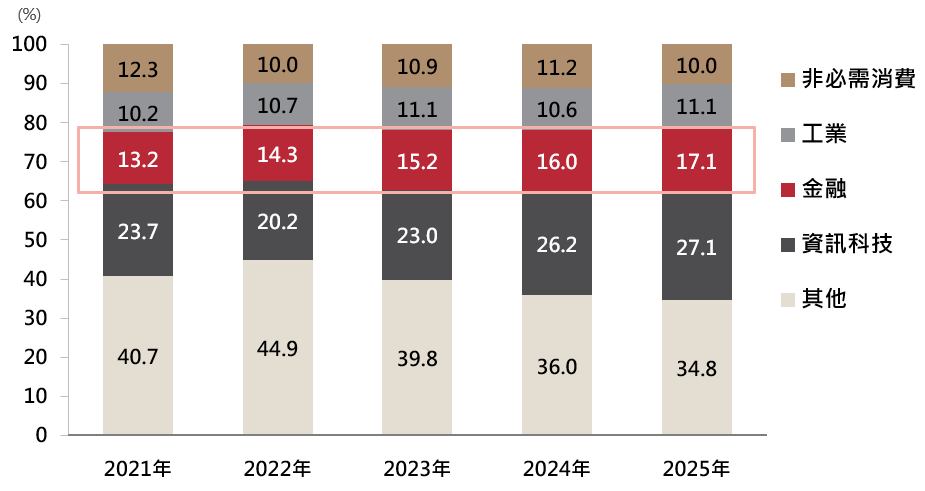 金融股較資訊科技股年化報酬少0.4%,但波動性少8.1%。波動性較小,因金融業是存量生意為主,非流量。