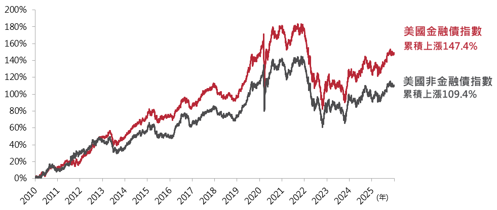 以上資料為舉例說明,不代表未來實際績效。以ICE BofA 10年期以上美國金融債指數(CF09)、ICE BofA 10年期以上美國非金融美元債指數(CF9X)為例;指數名稱後方所示為彭博代號。資料來源:Bloomberg,期間2010/1/1~2025/12/31。