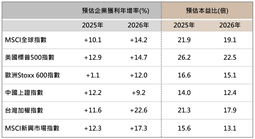 根據IBES Thomson Reuters、Bloomberg等資料顯示,預期2026年全球景氣溫和成長,企業獲利增速仍佳,回顧歷史經驗顯示,在降息環境及企業獲利成長的情況下,股市上漲機率高,現階段儘管評價略高,但基本面驅動股市向上動能。