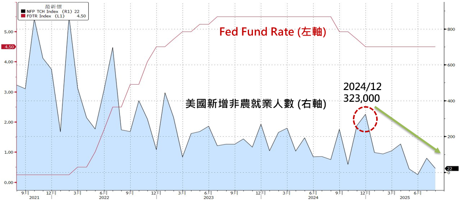 美國聯準會(Fed)於9月降息1碼至4.00% ~ 4.25%,主要是因為經濟數據顯示新增就業人數過低、聯邦基金利率(Fed Fund Rate)仍高於中性利率,而且到目前為止關稅對通膨影響比官員預期的還小,因此為預防失業率上揚,繼去(2024)年12月以來美國首次降息後,進一步的持續寛鬆政策。
