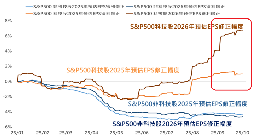 值得留意的是,美國科技股企業獲利預估大幅上修,主要是因為AI發展趨勢持續,金融市場對今明(2026)年科技股獲利預估大幅上修(如下表);此外,科技業獲利仍能支撐大量資本支出,觀察美國資訊科技業自由現金流仍在創新高,顯示大量資本開支仍能透過獲利支應。