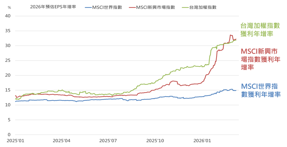 從基本面來看,相較於新興股市與全球股市,台股2026年獲利預估仍在持續上修中,而台股獲利結構亦帶動指數趨勢向上,根據Bloomberg統計,台股2026年預估獲利年增率,從去(2025)年第四季起明顯上修,如今已達33.1%。