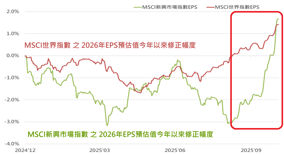 近來各國股市呈現高檔震盪,主因經過連續五個月上漲後,投資人擔心短線技術面已達偏過熱情況,不過觀察市場對MSCI世界指數、新興市場指數之2026年的獲利預估,卻在近幾個月大幅上修,而且企業獲利預估亦持續優於市場偏保守的預期。