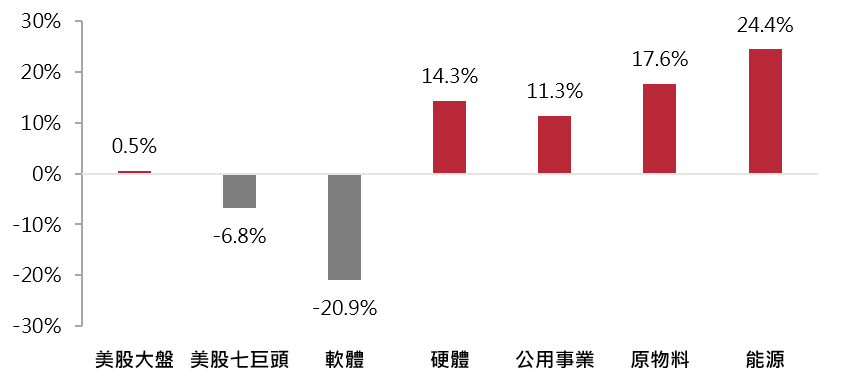 註:美股大盤採標普500指數、美股七巨頭採彭博美國七大科技巨頭指數(含Microsoft、Amazon、Nvidia、Alphabet、Tesla、Meta、Apple)、硬體類股採費城半導體指數、軟體類股採標普500軟體與服務指數、公用事業類股採標普500公用事業指數、原物料類股採標普500原物料指數、能源類股採標普500能源類指數。